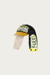 Kapital’s Kapsize Rulept cap flips the familiar trucker silhouette into something stranger and more charming. The structured front panel carries a hand-drawn graphic that feels like it wandered off a garage wall in a surf town, while the long sherpa-lined flaps give it a winter-friendly personality. It is playful, practical, and unmistakably Kapital. - Cotton front panel with mesh back - Sherpa-lined ear and neck flaps - Adjustable snapback - Printed Kapsize artwork - Contrast bill stitching - Made in Japan - Black/Gold