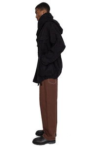 - A coat that you can enjoy various ways of wearing with many buttons and front bibs - Loose fit - The waist can be adjusted with a string - Color: Black - Fabric: 100% Cotton - Made In Japan - Style #: EK-789 - Model is 6'2 wearing a size 2