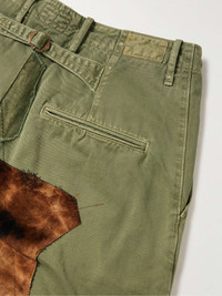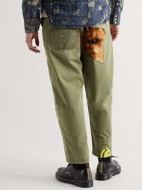 KAPITAL produces some of the most unconventional clothing and accessories out there. Take these 'Katsuragi' trousers for example - they're made from robust cotton-twill, intricately distressed and patchworked with a collage of different fabric swatches. Note the floral embroidery on the knees, too, which softens the overall effect. Size & Fit - Size 1 = XS, 2 = S, 3 = M, 4 = L, 5 = XL and 6 = XXL - Fits true to size. Take your normal size - Wide leg, mid-rise style - Mid-weight, non-stretchy fabric - Model wears a 3 - Model measures: waist size 32, height 6'2"/ 188cm Details & Care - Army-green and tonal-grey cotton-twill, multicoloured velvet - Button and zip fastening - 100% cotton; trim1: 37% modal, 30% cotton, 25% polyester, 8% silk; trim2: 100% wool - Hand wash
