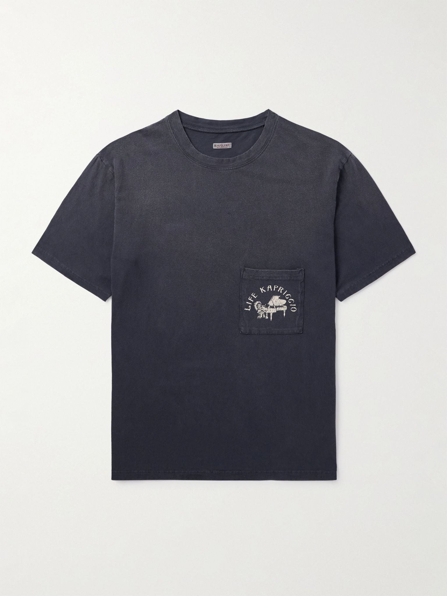KAPITAL's seasonal 'Life Kapriccio' graphics often feature playful imagery, like the piano player printed on the patch pocket of this T-shirt. It's been made in Japan from cotton-jersey that's intentionally faded for a lived-in look and feel. Size & Fit - Fits true to size. Take your normal size - Designed for a relaxed cut - Mid-weight, slightly stretchy fabric - Model is shown wearing a M - Model measures: chest 38"/ 96cm, height 6'0"/ 183cm Details & Care - Faded-black and beige cotton-jersey - 100% cotton - Machine wash