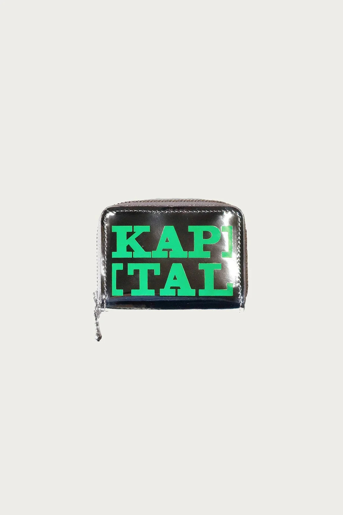 The THUMBS-UP Mini Wallet is a compact round-zip wallet made of glossy leather, with a sleek design and the iconic "KAP][TAL" logo. With a bill pocket, card pocket, and coin pocket, this wallet is both stylish and functional. - Metallic finish - Kapital Logo - Size:11cmx8.5cm - Green