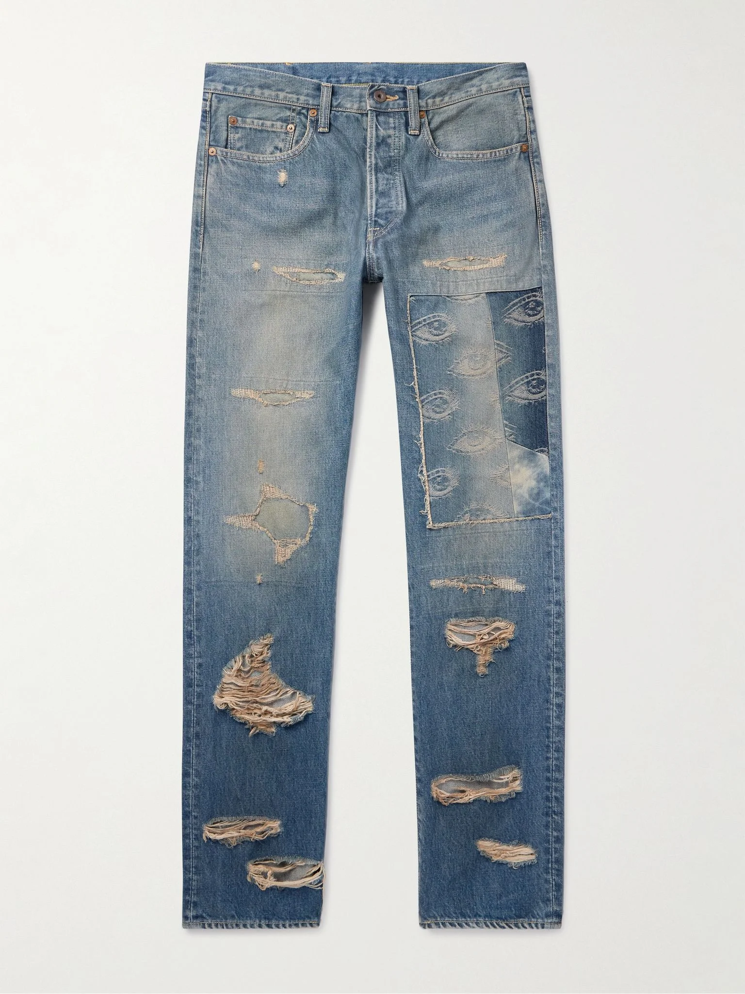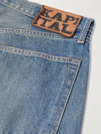 KAPITAL's name comes from Kojima, Japan's 'Denim Capital' so it's no surprise the details in its jeans are so carefully considered. This 14oz 'Monkey CISCO Speakeasy' style is faded, distressed and detailed with the signature eye motif. Size & Fit - Fits true to size. Take your normal size - Those with muscular thighs may wish to take the next size up - Slim cut, mid-rise style - Mid-weight, non-stretchy denim - Model is shown wearing a 32 - Model measures: waist size 32, height 6'0"/ 183cm Details & Care - Blue denim - Button fastenings - 100% cotton - Hand wash