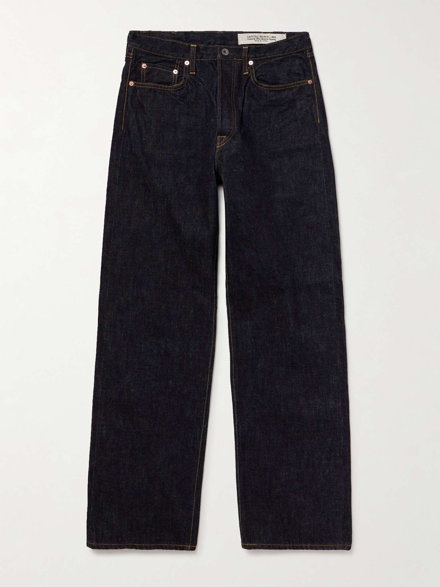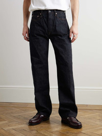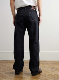 KAPITAL's straight-leg jeans have been made in Okayama, the birthplace of Japanese denim. They're made from 14oz. cotton-denim in a deep indigo wash and constructed with amber stitching. The logo patch is deliberately treated to look a little aged. Small to size. See Size & Fit notes. Size & Fit - Fits small to size. Take one size larger than normal - Regular-straight leg, mid-rise style - Rigid, non-stretchy denim - Model is shown wearing a 32 - Model measures: waist size 30, height 6'0"/ 183cm Details & Care - Indigo denim - Button fastenings - 100% cotton - Machine wash or dry clean