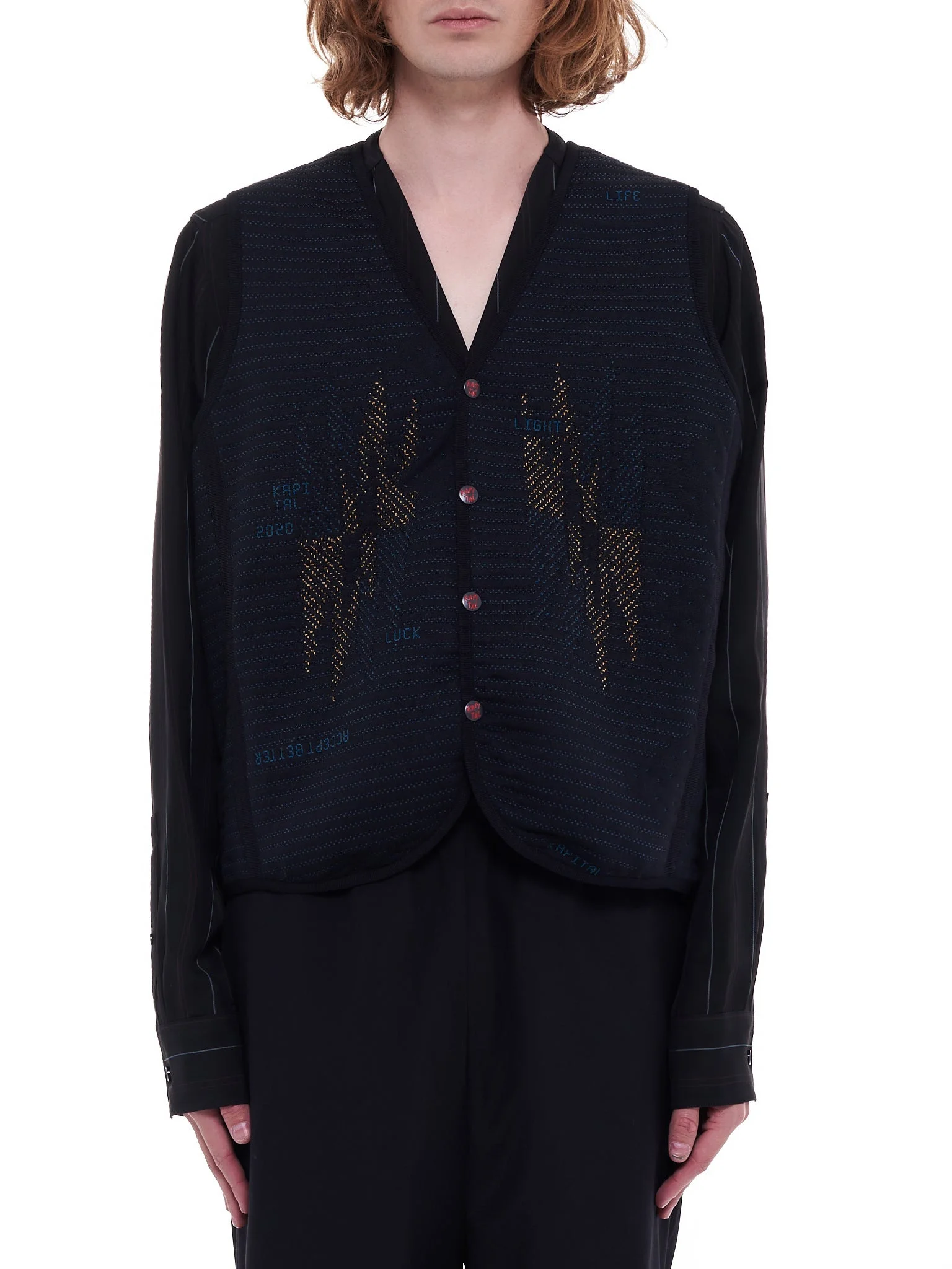 Kapital nylon knitted vest in black, On-Pattern 3D™ textile, knitted with Meryl® Nateo nylon; a premium nylon from Spain which uses eco-dyeing and eliminates water use for dying, cotton-feel nylon boasts properties commonly identified for active wear, v-neckline, snap button closure, meticulously placed graphics throughout, straight/finished hem, tonal stitching. Made in Japan. Japanese Sizing. Composition - 100% Nylon Knitted Textile Model Measurements: Model is 6ft 2” and wearing a size 3. Shoulders: 17” Chest: 36” Waist: 29”