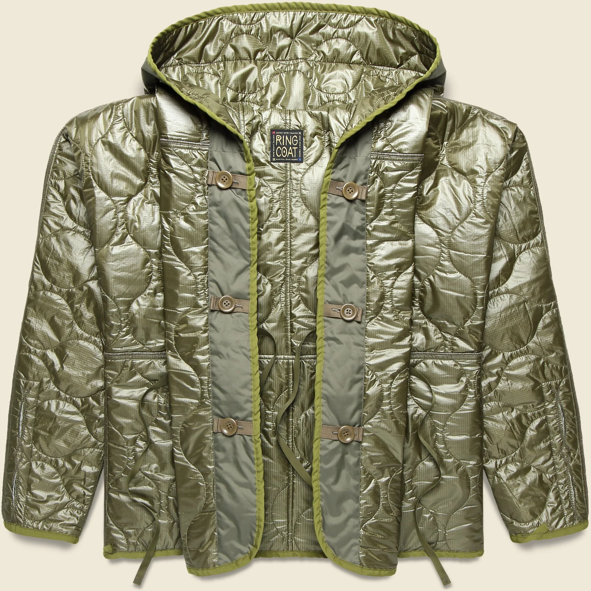 Taking inspiration from a classic army liner, kimono, and a peacoat, then running wild with it, the Nylon Quilting Lining RING Coat from Kapital has a quilted construction to keep you nice and warm and offers multiple styling options with the double-breasted front closure and collar. Made from weather-resistant yet soft nylon and tailored with an oversized fit for easy layering, it comes with a unique, kimono-style front closure and a unique collar that can easily convert into a hood if the weather turns sour. - Weather-resistant quilted nylon construction - Double-breasted kimono-style front closure - Unique oversized collar-hood design - Hood can be rolled and buttoned into a shawl collar - Clean-finished seams - Buttons at the placket to attach as a coat liner - Relaxed, oversized fit - We recommend taking your normal size Made in Japan Materials: Shell: 100% nylon | Fill: 100% polyester | Piping: 100% polyester The following measurements are for Size 2: Chest: 48” | Shoulder: 22” | Sleeve: 37” | Length: 29”