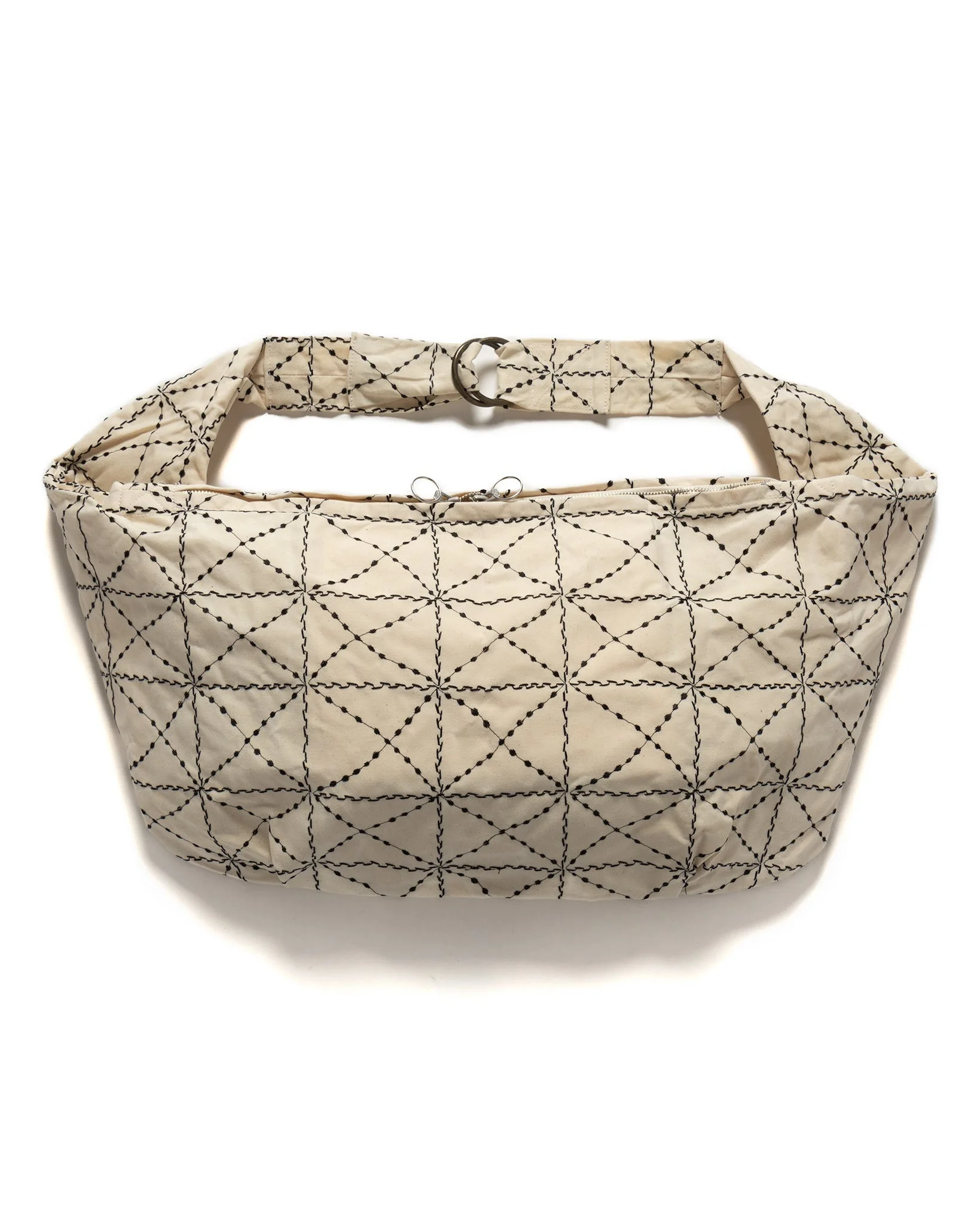 Made from paraffin-treated cotton, this bag offers a crisp, structured finish that enhances durability and wear resistance. Its hand-embroidered sashiko design adds a unique and sophisticated touch, celebrating traditional Japanese craftsmanship. The one-shoulder style ensures a snug and comfortable fit, while the spacious interior with a mesh pocket and zippered closure provides ample storage for everyday essentials. DETAILS - K2409XB509 - 100% cotton - Lining: 100% polyester - Embroidery: 100% rayon - Paraffin-treated cotton - Hand-embroidered sashiko detailing - Double zipper main closure - Mesh lined interior with zippered pocket - Adjustable shoulder strap - Cowhide leather accents - Made in Japan