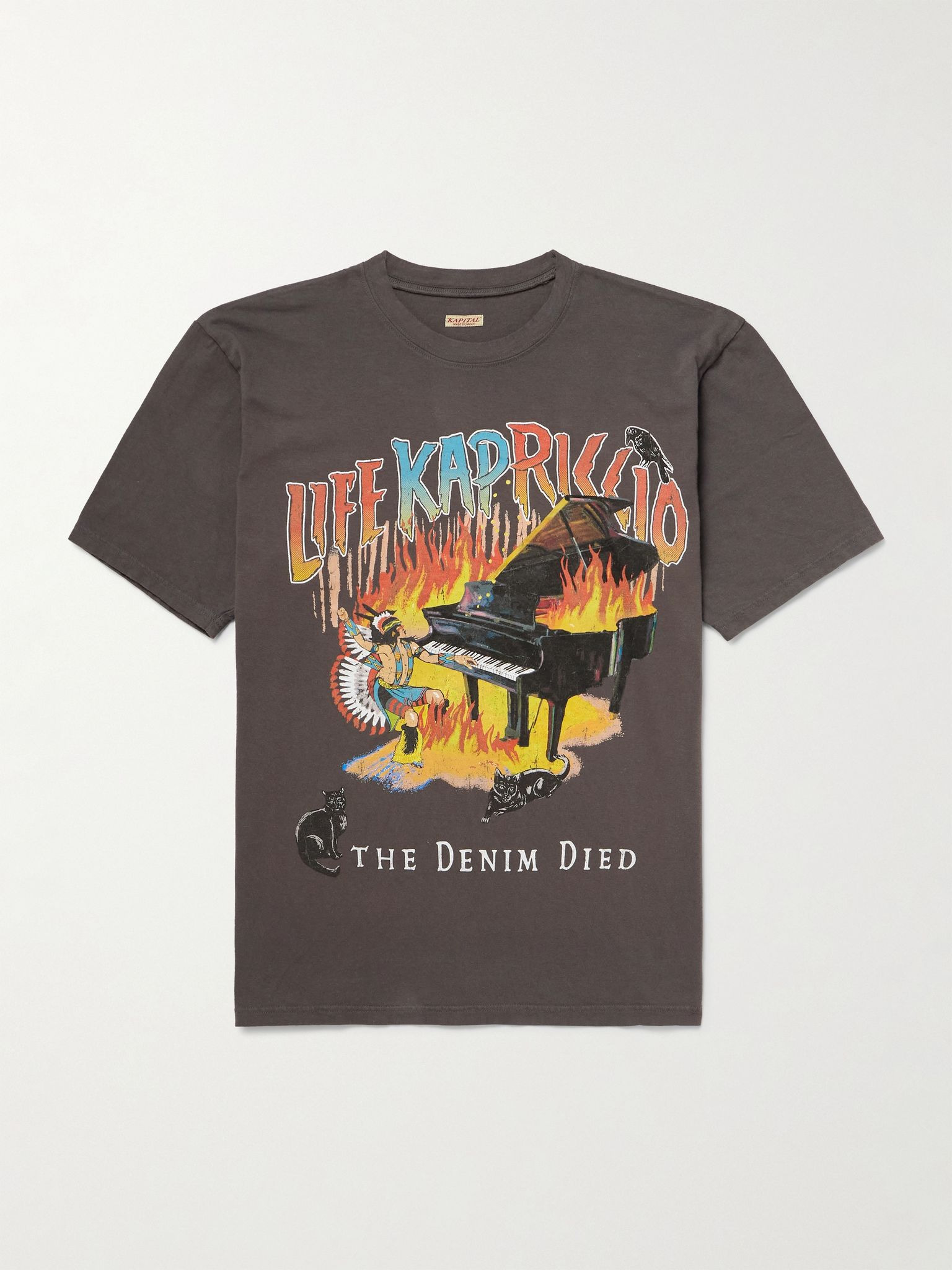 KAPITAL's 'Burning Piano' T-shirt is like a fever dream – it's printed with a mishmash of motifs, including fire, cats and a crow. Made in Okayama, Japan, it has slightly dropped shoulders and a wide, ribbed neck for a relaxed look and feel. Size & Fit - Model wears a size larger to achieve a looser fit - Mid-weight, stretchy fabric - Model is shown wearing a M - Model measures: chest 36"/ 92cm, height 6'0"/ 183cm Details & Care - Multicoloured cotton-jersey - 100% cotton - Dry clean