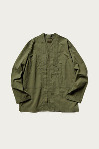 A noragi style shirt tailored with a rugged but soft cotton ripstop. Super comfortable and easy to layer, this is a perfect version to help mix up your usual cardigan or shirt. Fits true to size. - 100% Cotton - Ripstop - Noragi-Style - Faded Wash - Run-off Side Detail - Khaki