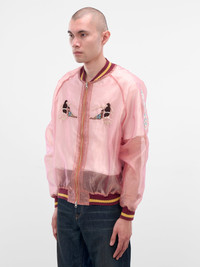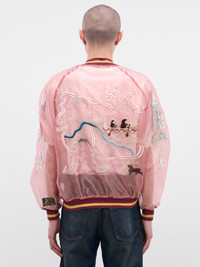 Featuring: • Relaxed fit • Souvenir jacket design • Semi-sheer polyester construction • Embroidered Yukon River souvenir graphics • Striped ribbing at hems • Stand collar • Two way zip closure • Long sleeves • Made in Japan • Main: 100% Polyester | Rib: 100% Cotton • Japanese sizing Model is 6'0" wearing size 1. Shoulders: 17" Chest: 30" Waist: 28"
