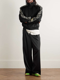 KAPITAL's 'TH.D.D.' jacket is meant to be worn with the matching track pants in our edit. Made in Japan from tech-jersey, it's cut for a relaxed fit and traced with peace sign jacquard webbing down the sleeves. Size & Fit - Size 1 = XS, 2 = S, 3 = M, 4 = L, 5 = XL and 6 = XXL - Fits true to size. Take your normal size - Designed for a relaxed fit - Mid-weight, stretchy fabric - Model is shown wearing a 3 - Model measures: chest 38"/ 96cm, height 6'2"/ 188cm Details & Care - Black tech-jersey, black and cream webbing - Zip fastening - 100% polyester - Machine wash