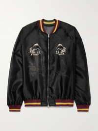 KAPITAL's bomber jacket is cut from sheer organza resembling insect netting - it's even appliqued with a patch declaring it 'mosquito proof'. Modelled on Japanese sukajan, it's traced with ribbed trims and embroidered with landscapes and a roaring tiger. Size & Fit - Size 1 = XS, 2 = S, 3 = M, 4 = L, 5 = XL and 6 = XXL - Model wears a size larger to achieve a looser fit - Ribbed hem - Lightweight, semi-sheer, non-stretchy fabric - Model is shown wearing a 3 - Model measures: chest 38"/ 96cm, height 6'1"/ 185cm Details & Care - Black organza, burgundy, yellow and green cotton - Two-way zip fastening - 100% polyester; trim: 100% cotton - Dry clean