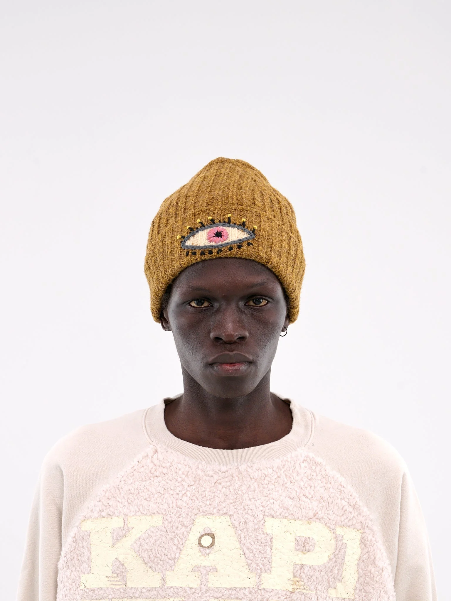 KAPITAL beanie in gold, wool knit construction, rib-knit, Speakeasy graphic eye embroidery, fitted. Made in Japan Fabric: 97% Wool 3% Polyurethane Embroidery: 50% Wool 20% Cotton 20% Acrylic 10% Nylon One Size