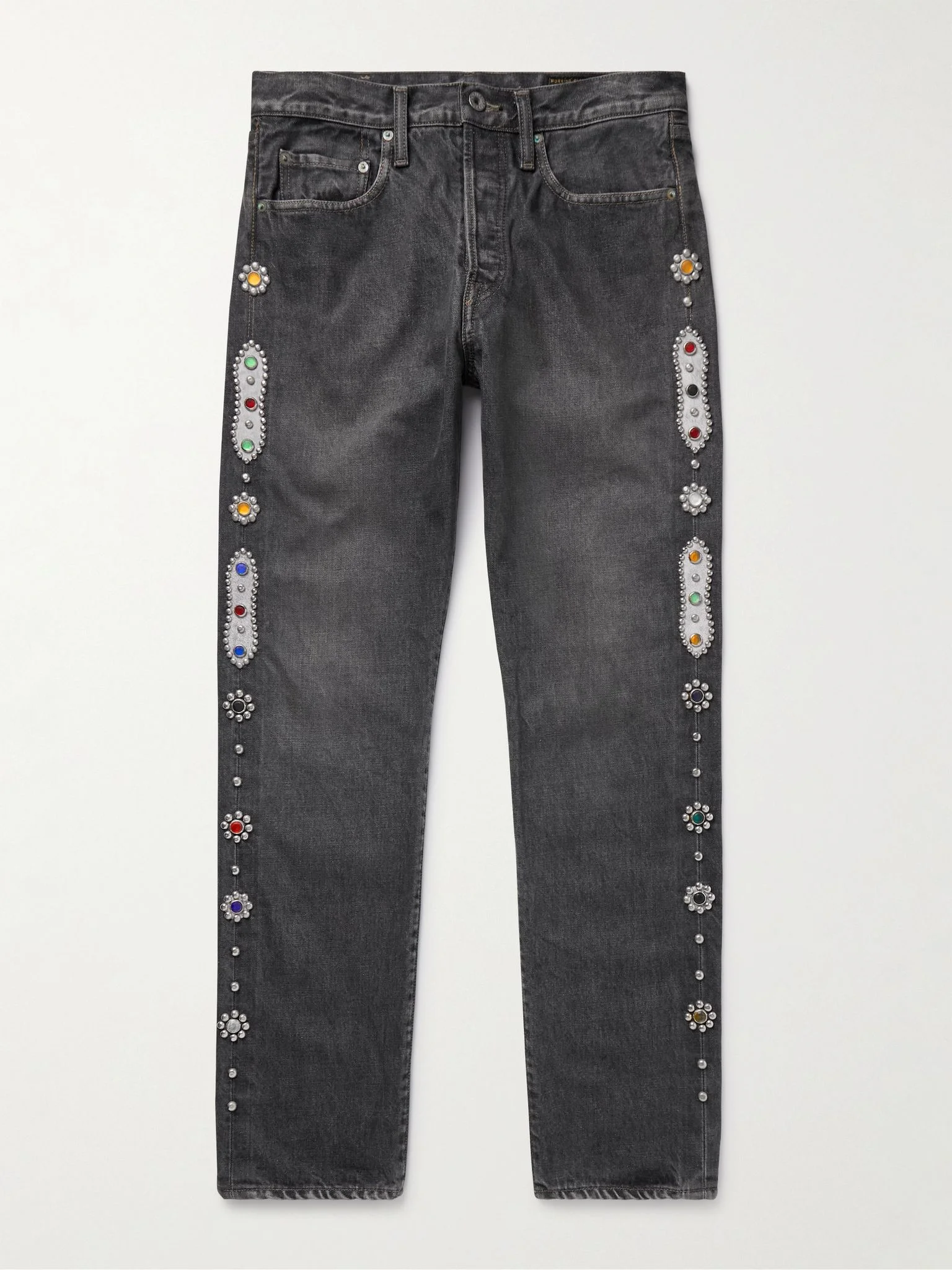 KAPITAL's name comes from Kojima, Japan's 'Denim Capital' so it's no surprise the details in its jeans are so carefully considered. This 'Monkey CISCO' style is cut from 14oz. faded denim and embellished with leather trims and crystal studs along the sides. Size & Fit - Fits true to size. Take your normal size - Regular-straight leg, mid-rise style - Mid-weight, non-stretchy fabric - Model is shown wearing a 32 - Model measures: waist size 32, height 6'1"/ 185cm Details & Care - Faded-black denim, grey leather - Button fastenings - 100% cotton; trim: 100% leather - Hand wash