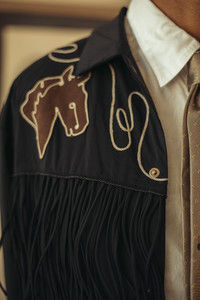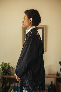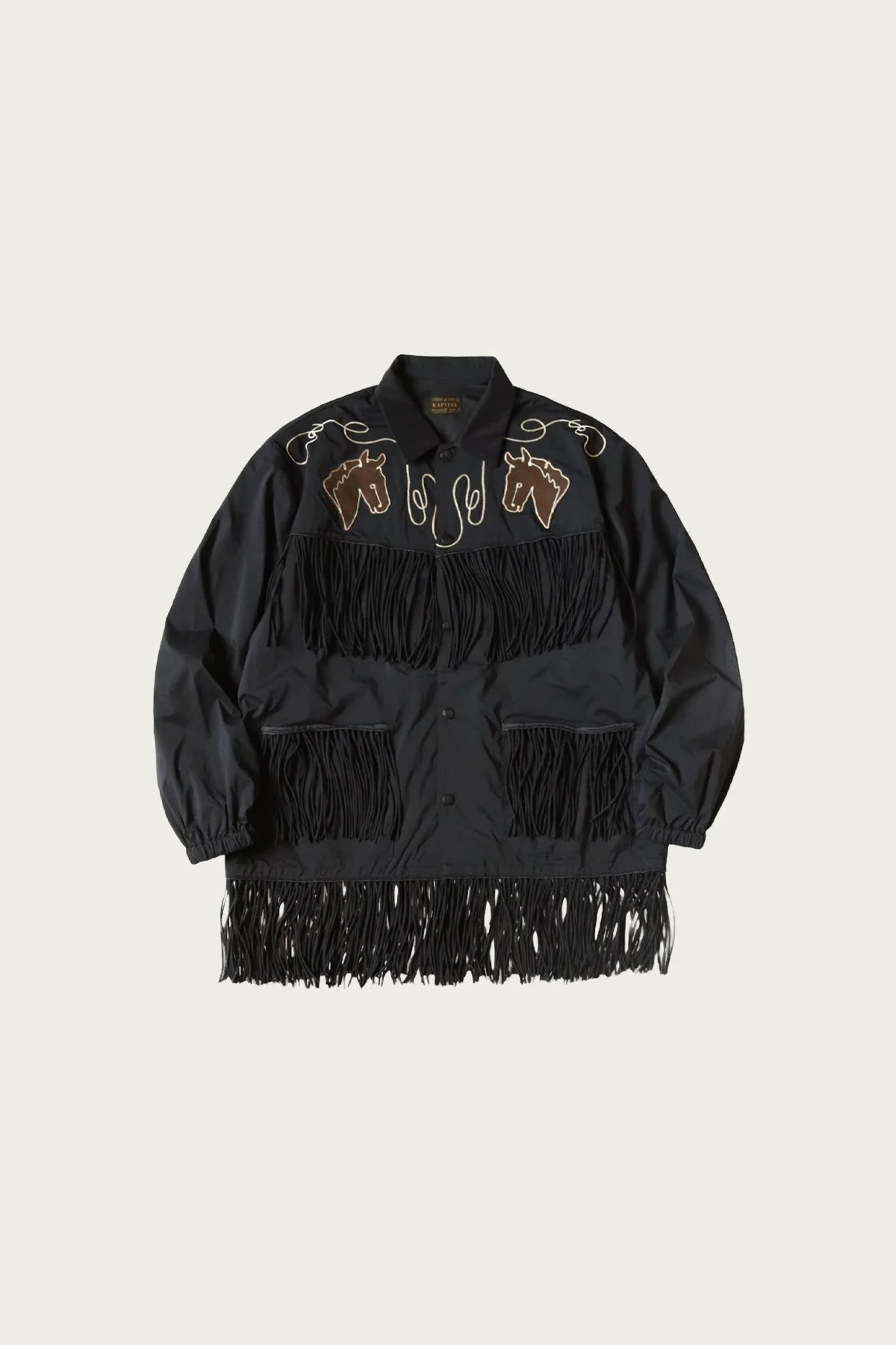 A sport-style coach jacket flipped through a Kapital lens-- lightweight stretch nylon body, classic snap front, and exaggerated Western-style fringe detailing across the chest and back. Surprisingly wearable, especially when layered with something simple underneath. - Stretch nylon shell - Tonal fringe front and back - Snap button front - Slanted welt pockets - Drawcord hem - Black