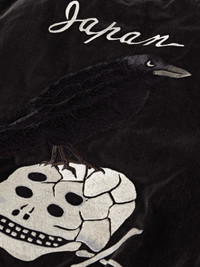 KAPITAL's latest 'Souvenir' jacket is embroidered with both raven and skull motifs, along with a reference to the brand's native Japan. Locally made from cotton-velvet, it's trimmed with striped ribbed trims and lightly padded for warmth. Size & Fit - Size 1 = XS, 2 = S, 3 = M, 4 = L, 5 = XL and 6 = XXL - Fits true to size. Take your normal size - Designed for a relaxed fit - Ribbed hem - Padded, non-stretchy fabric - Model is shown wearing a 3 - Model measures: chest 38"/ 96cm, height 6'2"/ 188cm Details & Care - Black cotton-velvet - Zip fastening - 100% cotton; padding: 100% polyester
