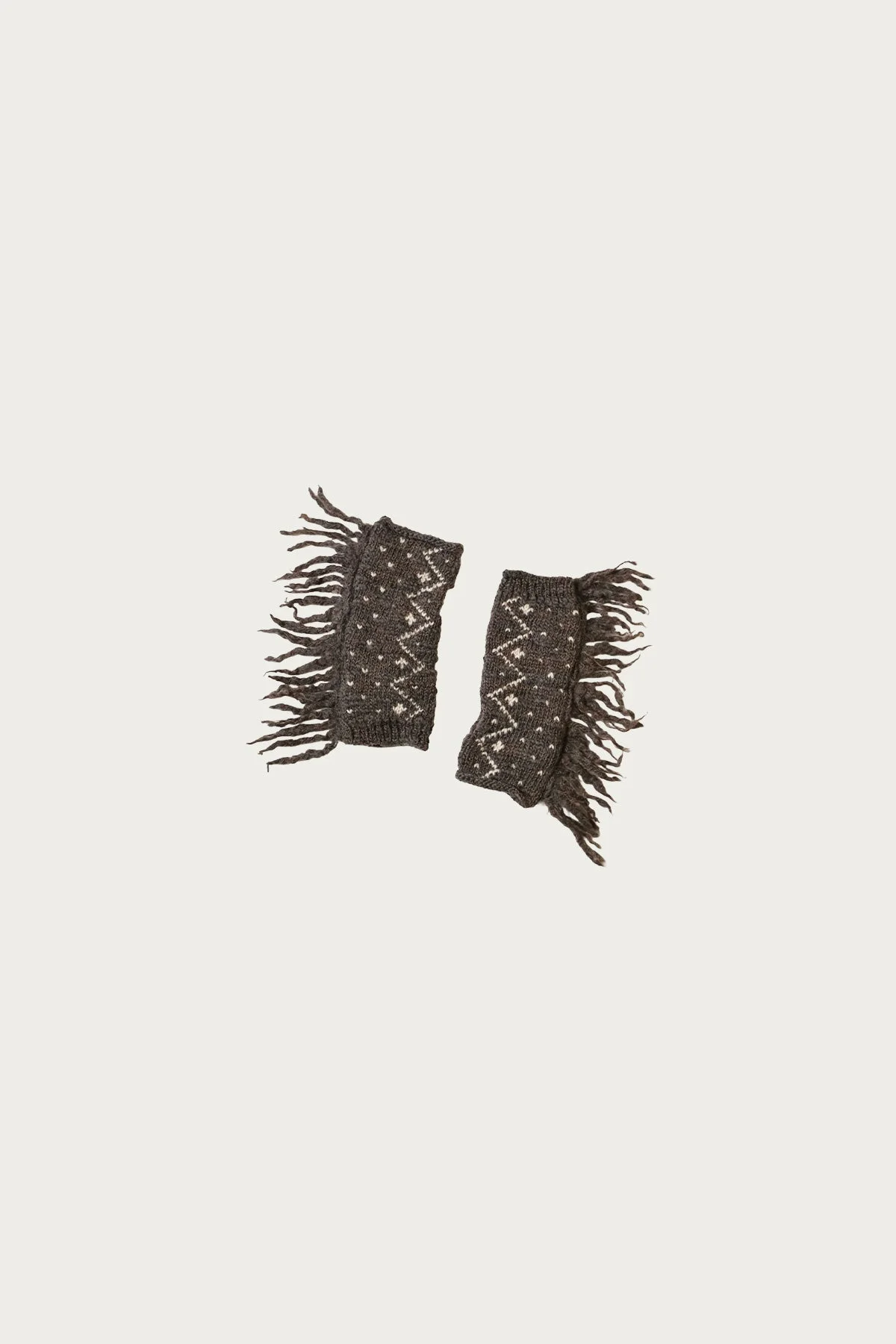 These hand warmers are one of those quietly iconic Kapital accessories. Knitted with a chunky 3-gauge wool blend and finished with long, unraveled fringe, they bring that handmade, slightly wild character that the brand does so well. The jacquard patterning shifts from small scattered dots to zigzag motifs, giving each pair a lived-in, textural feel. Wear them with oversized layers, denim, or anything that could use a little extra personality and warmth. - 3G chunky knit construction - Wool blend with soft handfeel - Signature Kapital fringe edges - Jacquard pattern throughout - Thumbhole opening - Made in Japan - Dark Brown