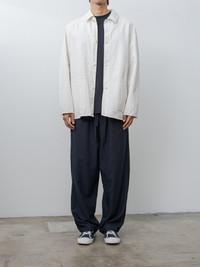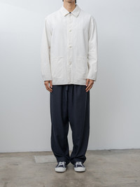 A relaxed-fit coverall jacket cut from chambray-woven cotton drill made with thick extra-long staple yarns, creating a beautifully textured surface with subtle color variation. Features dropped shoulders, two patched front pockets, donut buttoned front and cuffs, an unlined interior, and a washed finish. - Made in Japan - 100% Cotton - Available in Black and Ecru - The model is 6'1"/185cm and wears size 4/L