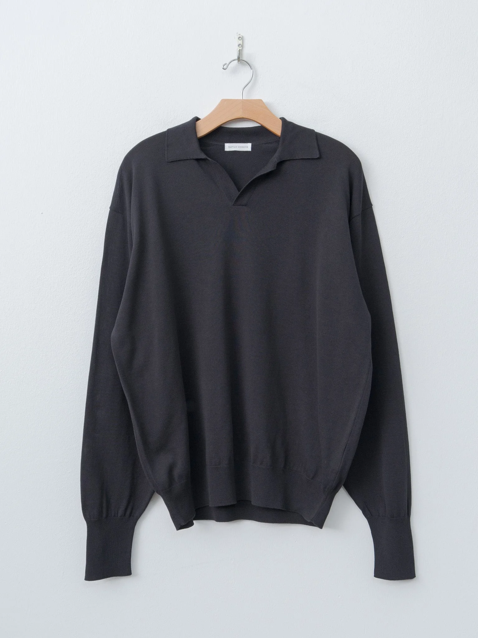 A skipper polo knit made from high-gauge jersey knit cotton using air-spun Supima yarns, resulting in a smooth surface with a dry touch and light structure. Features an open V-neck placket, soft collar, dropped shoulders, and ribbed cuffs and hem. Loose fit. - Made in Japan - 100% Cotton - Available in Dark Navy and Lilac - The model is 6'1"/185cm and wears size 4/L