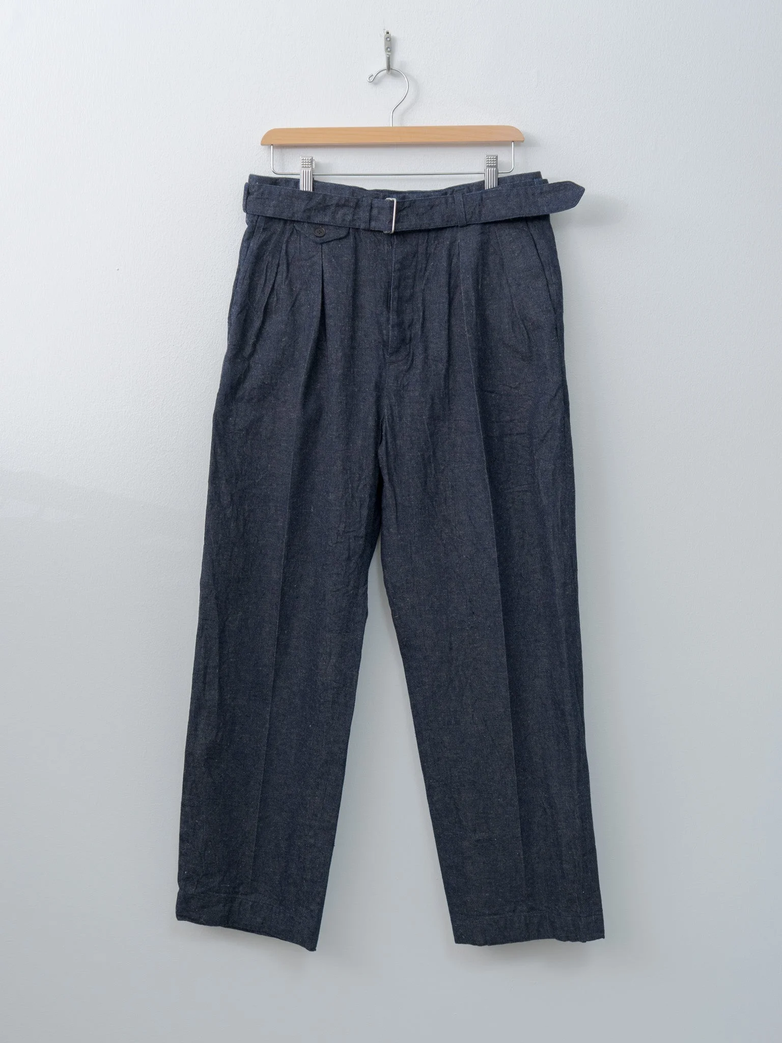 A double-pleat belted trouser crafted from a 9oz indigo-dyed selvedge denim blended with natural neps and linen. It is slow-woven on vintage looms to develop rich slubs and a texture that deepens in color and character with age. Features a wide, straight leg fit, double forward pleats, front crease, a matching removable belt, side pockets, back flap pockets, and a washed finish. - Made in Japan - 85% Cotton, 15% Linen - Available in Indigo - The model is 6'1"/185cm and wears size 3/M, 32 waist