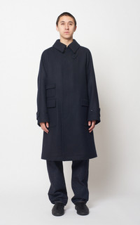 This is the most popular model from Kaptain Sunshine, known for its timeless design and outstanding fabric quality. Made of a high-density reverse double-cloth Melton, woven using ultra-fine 16.5-micron Super 140s wool. This fabric achieves a perfect balance of firmness and lightness. Dyed together with cotton to create a rich, deep color, it offers exceptional softness, a subtle sheen, and refined suppleness thanks to its dense weave. - Style: Traveller Coat - Fit: Loose fit - Color: Navy - Material: 100% wool - Made with ultra-fine 16.5-micron Super 140s wool - Reverse double-cloth Melton woven at high density - Perfect balance of firmness and lightness - Dyed together with cotton for a rich, deep color - Dense weave - Made in Japan