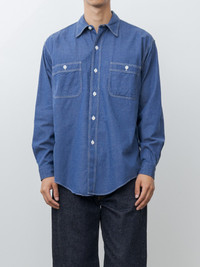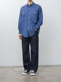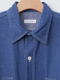 A work shirt crafted from a high-density blend of extra-long Suvin cotton and hemp, woven with indigo-dyed yarn that will develop rich character over time. Details include chest pockets, side gussets, double-needle stitching, and a selvedge detail at the placket. - Made in Japan - 95% Cotton, 5% Hemp - Available in Indigo Blue - The model is 6'1"/185cm and wears size 4/L