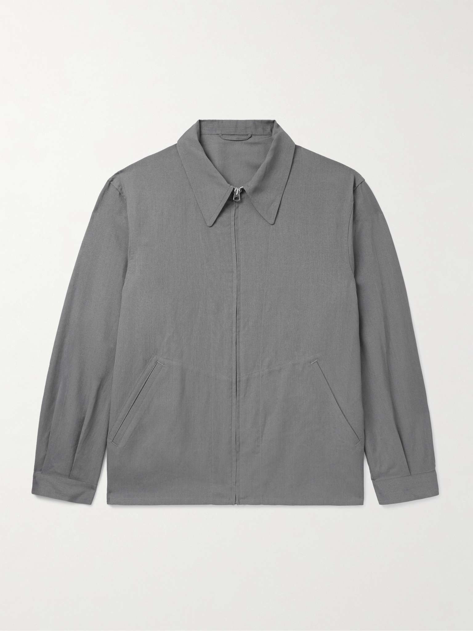 Kaptain Sunshine's founder appreciates uniform dressing, which is evident in the clean lines of the label's wardrobe staples. This blouson jacket is cut from a wool-blend and has a smart point collar. Size & Fit - JP 36 = S, JP 38 = M, JP 40 = L and JP 42 = XL - Fits true to size. Take your normal size - Designed for a relaxed fit - Mid-weight, non-stretchy fabric - Model is shown wearing a 38 - Model measures: chest 38"/ 96cm, height 6'0"/ 183cm Details & Care - Grey wool-blend - Zip fastening - 50% wool, 50% paper - Dry clean