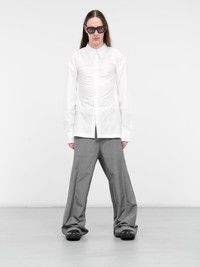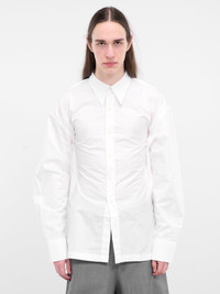 KARMUEL YOUNG shirt in white, paneled construction, pointed collar, back detailing, front buttoned placket closure, long sleeves, barrel cuffs, slim fit chest detailing, straight hem, relaxed fit. European Sizing Model is 5’11” wearing size 48. Shoulders: 15” Chest: 17.5” Waist: 28”