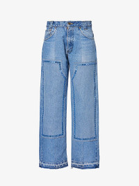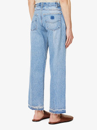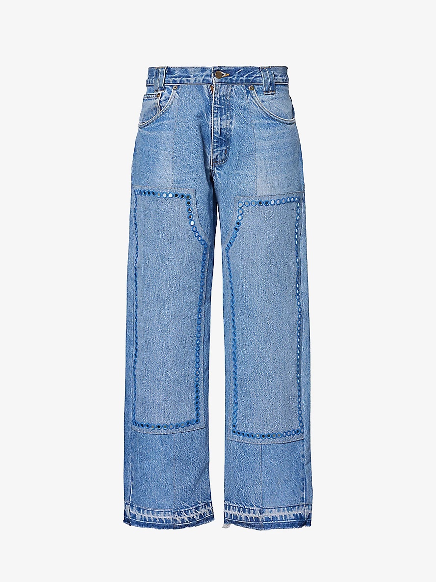PRODUCT DETAILS - Kartik Research denim jeans - 100% cotton - Button and zip-fly fastening - Regular fit, mid-rise, straight leg, structured waistband with belt loops, five pockets, embroidered mirrored sequins at front, panelled, mid-wash, raw hems - Dry clean only - Made in India - Size medium: rise 11in / 28cm, inside leg 30in / 76cm, leg opening 18in / 46cm - Model is 6ft 2in/1.88m and wears a size medium - Midweight, non-stretch Ref: R04308008