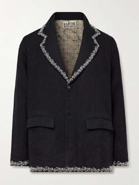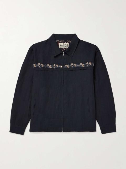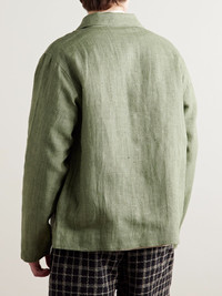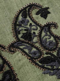Kartik Research honours India's craft heritage by incorporating handmade elements into every design. This linen overshirt is finished with an embellished paisley motif consisting of beads, embroidery and gold-tone coils. Layer yours over a tee. Responsible Craftsmanship. This product promotes artisanal skills and a brand that invests in communities and adheres to fair-trade principles. Find out more about our Consciously Crafted criteria here. Size & Fit - Fits true to size. Take your normal size - Designed for a regular fit - Lightweight, non-stretchy fabric - Model is shown wearing a M - Model measures: chest 38"/ 96cm, height 6'1"/ 185cm Details & Care - Army-green linen - Button fastenings - 100% linen; buttons: 100% horn (Buffalo) - Green dry clean