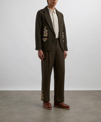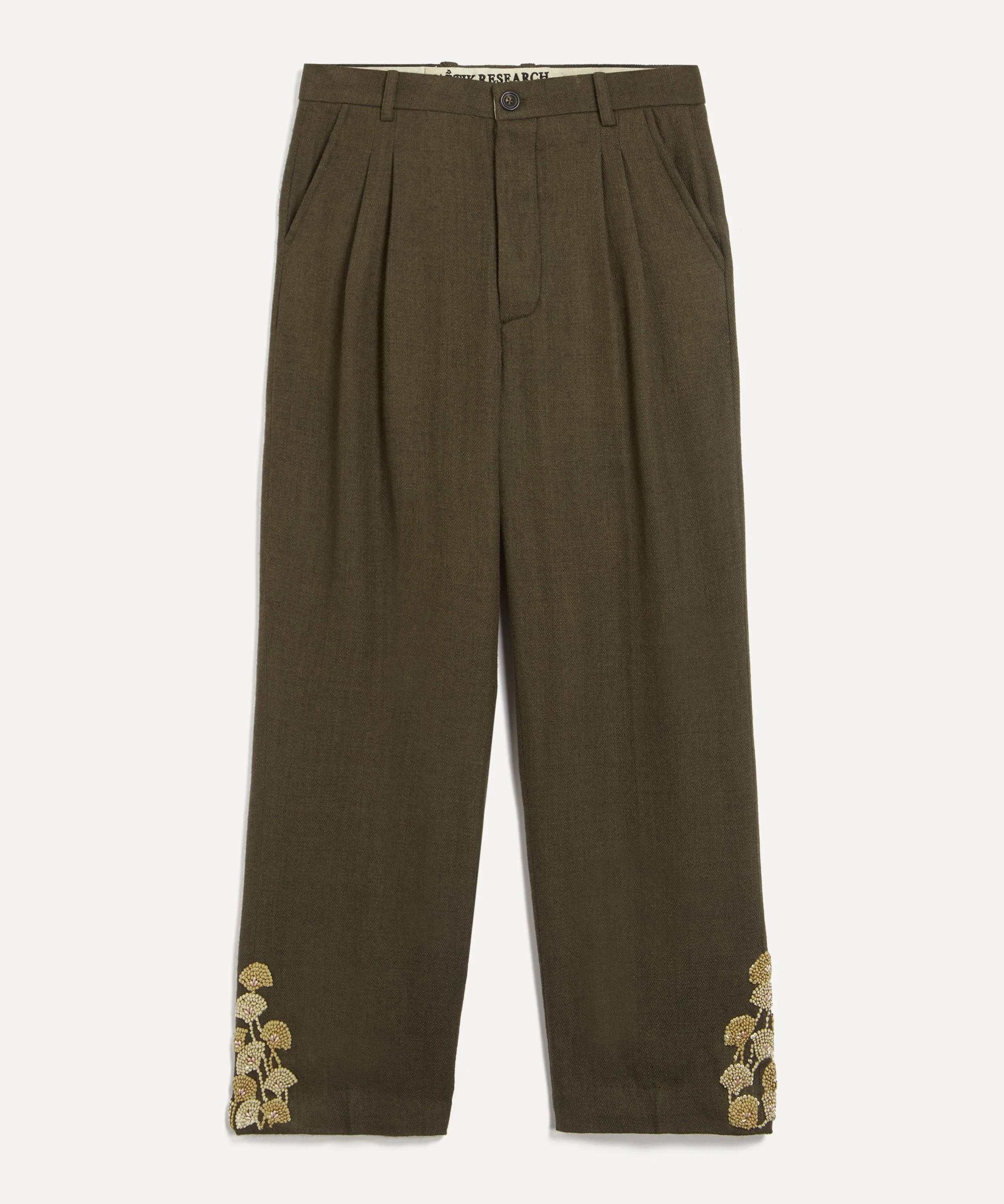 DETAILS Wool herringbone trousers Exclusive to Liberty Regular fit Straight leg Button, zip fly Belt loops Side pockets Rear welt pockets Zardoni embroidery Handmade in India Model is 188cm/6'2"; Chest: 92cm; Waist: 80cm and wears a size 32 COMPOSITION & CARE 100% Wool Dry clean
