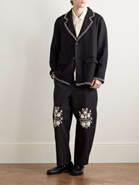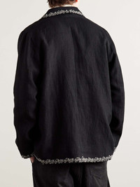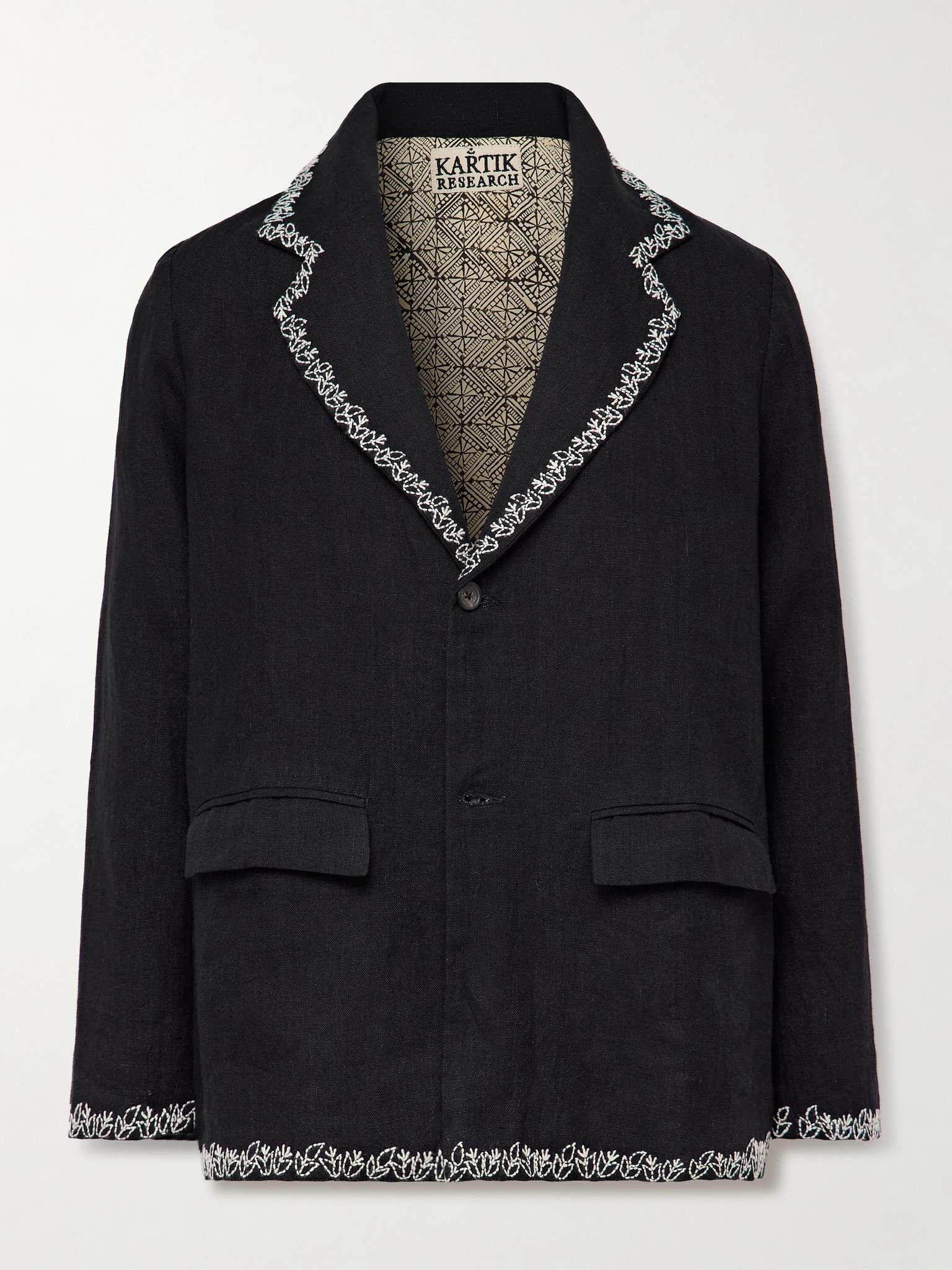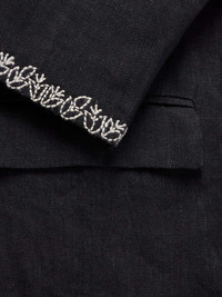 Kartik Research's designs are carefully handcrafted, ensuring that every piece possesses distinct character and charm. This unstructured blazer is woven from lightweight linen, embroidered with floral motifs and has oversized flap pockets at the front. Responsible Craftsmanship. This product promotes artisanal skills and a brand that invests in communities and adheres to fair-trade principles. Find out more about our Consciously Crafted criteria here. Size & Fit - Fits true to size. Take your normal size - Designed for a relaxed fit - Lightweight, non-stretchy fabric - Model is shown wearing a M - Model measures: chest 38"/ 96cm, height 6'1"/ 185cm Details & Care - Black linen - Notch lapels, two front flap pockets, fully lined - Two button fastening - 100% linen; buttons: 100% horn (Buffalo) - Green dry clean