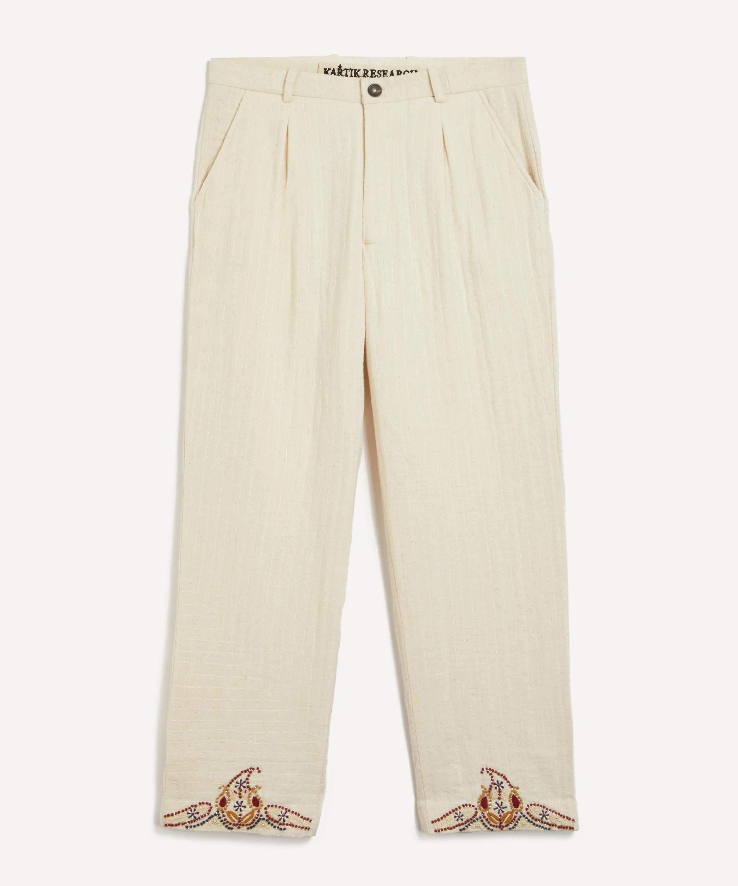 DETAILS Kantha-stitched cotton trousers Exclusive to Liberty Regular fit Straight leg Button, zip fly Belt loops Side pockets Rear welt pockets Zardoni embroidery Handmade in India Model is 188cm/6'2"; Chest: 92cm; Waist: 80cm and wears a size 32 COMPOSITION & CARE 100% Cotton Dry clean