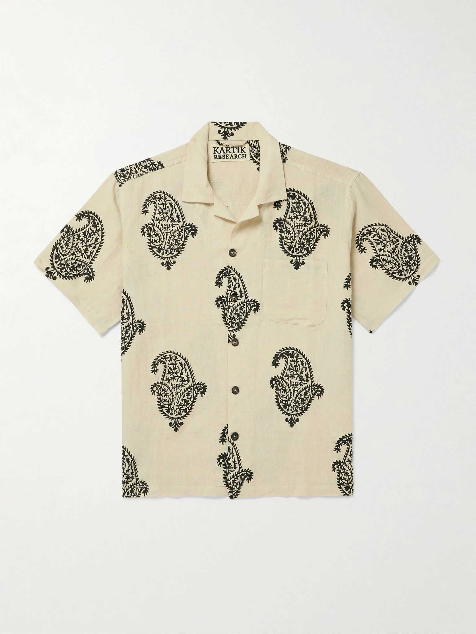 From Gujarat to Rajasthan, India has followed various block-print processes for hundreds of years. This shirt has been made in India from ecru linen and patterned with oversized paisleys across the front and back. The relaxed camp collar makes it a good choice for summer. Responsible Craftsmanship. This product promotes artisanal skills and a brand that invests in communities and adheres to fair-trade principles. Find out more about our Consciously Crafted criteria here. Size & Fit - Fits true to size. Take your normal size - Designed for a relaxed fit - Lightweight, non-stretchy fabric - Model is shown wearing a M - Model measures: chest 38"/ 96cm, height 6'2"/ 188cm Details & Care - Ecru and black linen - Button fastenings - 100% linen; buttons: 100% horn (Buffalo) - Dry clean