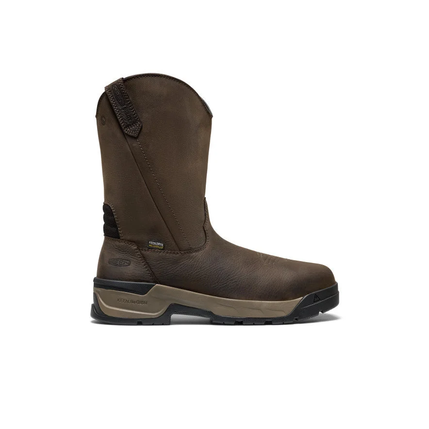 Rugged stability meets classic square-toe style in this lightweight waterproof pull-on boot. Easier fitting with built-in flex, plus sturdy heel and underfoot support for all-surface comfort. Product Details STYLE NUMBER: 1031451 WEIGHT PER SHOE: 29.07oz / 824g SHAFT HEIGHT: 10.12in / 257mm HEEL HEIGHT: 0.98in / 25mm HEEL-TO-TOE DROP: 0.47in / 12mm DUTY TYPE: Medium Features - KEEN.DRY waterproof, breathable membrane seals out moisture from the inside - Heat-resistant rubber outsole rated up to 572°F/300°C - 100% non-metallic construction for easily passing through metal detectors in highly-secured areas - Non-mutilating upper reduces the chance of marking or scratching surfaces - Cement construction for flexible, lightweight performance. - KEEN.LOCKFIT firm U-shaped support provides extra heel stability - External Stability Shank (ESS) for midfoot support - Environmentally preferred premium leather from LWG-certified tannery for cleaner water - PFAS-free, durable water repellent repels water just as well as forever chemicals without harming the planet Materials - KEEN.ReGEN lightweight, compression-resisting midsole providing up to 50% energy return with every step - Oil- and slip-resistant non-marking rubber outsole - Electrical hazard (EH) or Electric Shock Resistant (ESR) footwear helps provide a secondary source of protection in case of accidental outsole contact with live electrical circuits - Full-grain Barnyard Resistant leather helps resist the damaging effects of jobsite chemicals like oleic acid, urea, sodium chloride, and ammonium hydroxide - Removable metatomical insole for comfort and support - Leather Thickness: 1.60-1.80mm - Mesh liner provides breathability to help keep feet cool in warm environments Care - Gently brush with a soft, damp sponge to remove loose dirt. Treat stains right away with a gentle cleaner. Safety Features - Left and right asymmetrical, non-metallic carbon toes offer unobtrusive fit and are 15% lighter than steel - 90° heel (1/2'' Height) helps provide secure footing on ladders, scaffolding, or loose, uneven surfaces - Meets ASTM F3445-24 and F2413-18 M I/75 C/75 EH standards - Meets ASTM F2913-24 SATRA non-slip testing standards - Outsole and midsole meets ASTM D471-06 903# oil and isooctane chemical resistance standards
