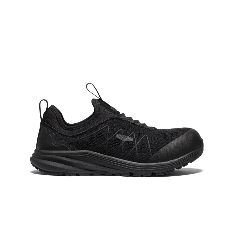 Designed with game-changing midsole cushioning and a breathable upper, this slip-on ESD work sneaker provides dynamic support, plus protects the workpiece. Product Details STYLE NUMBER: 1026371 WEIGHT PER SHOE: 17.0oz / 482g SHAFT HEIGHT: 5.51in / 140mm HEEL HEIGHT: 0.93in / 23mm HEEL-TO-TOE DROP: 0.39in / 10mm DUTY TYPE: Light Features - 100% non-metallic construction for easily passing through metal detectors in highly-secured areas - Non-mutilating upper reduces the chance of marking or scratching surfaces - Nylon shank for midfoot support Materials - KEEN.ReGEN lightweight, compression-resisting midsole providing up to 50% energy return with every step - Oil- and slip-resistant non-marking rubber outsole - Electro static dissipative (ESD) or Super-Static Dissipative (SD+) footwear is constructed to dissipate excess static electrical charges, protecting the workpiece - Removable metatomical insole for comfort and support - Mesh liner provides breathability to help keep feet cool in warm environments Care - Gently brush with a soft, damp sponge to remove loose dirt. Treat stains right away with a gentle cleaner. Air dry away from heat. Safety Features - Left and right asymmetrical, non-metallic carbon toes offer unobtrusive fit and are 15% lighter than steel - Meets ASTM F3445-21 and F2413-18 M I/75 C/75 ESD/SD 35 standards - Meets ASTM F1677-96 Mark II non-slip testing standards - Midsole meets ASTM D471-06 903# oil and isooctane chemical resistance standards