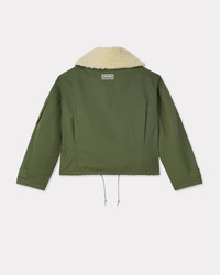 ARMY flight jacket. Detachable fleece collar. Lined. One arm pocket. Two buttoned flap pockets and two fly pockets on the front. Velcro cuffs. Product Reference: FE65BL1499OB.51 SIZE & FIT Boxy fit. Back length at 62 cm. The male model is 185 cm tall and is wearing size M. COMPOSITION & CARE Made in Bulgaria 53% cotton, 47% polyamide Do not bleach Mild professional dry-cleaning in: hydrocarbons Iron at low temperature Line drying in the shade Do not tumble dry Do not wash Do not wet-clean