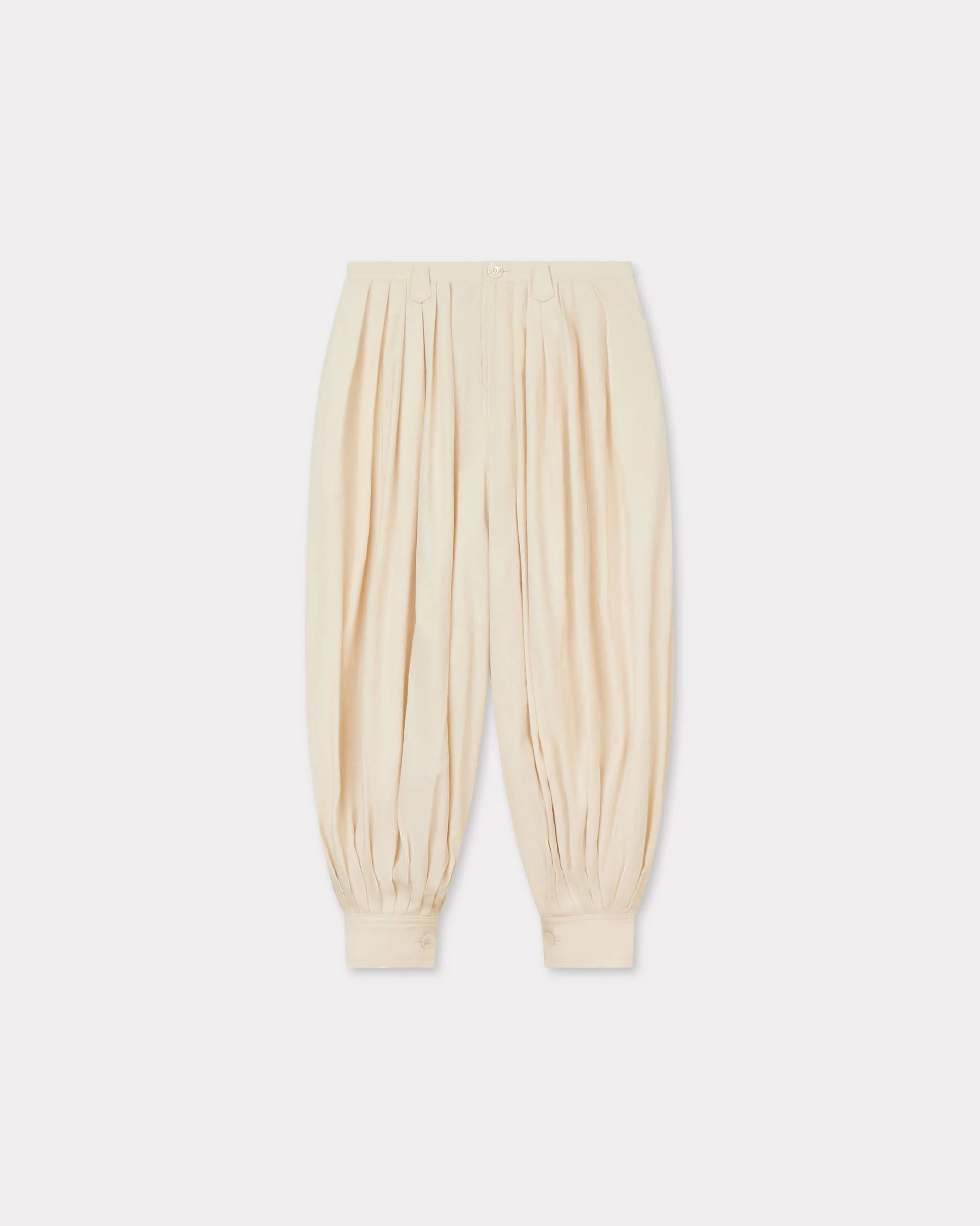 Balloon pants in cotton. Pleats at front, back and bottom. V-cut at back and belt loops. Button & zip closure at front. Pink heart inside the fly flap. Button at the bottom leg. Mother-of-pearl button engraved 'KENZO Paris'. KENZO Archive tonal signature at bottom leg. Product Reference: FF62PA1179BE.03 SIZE & FIT The model is 175 cm tall and is wearing size S. Oversize fit. Low-waist. The fit of this product is oversized. For a more fitted look, we recommend choosing one size smaller than your usual size. COMPOSITION & CARE Made in Romania 56% cotton, 44% hemp Do not bleach Mild professional dry-cleaning in: hydrocarbons Iron at low temperature Line drying in the shade Do not tumble dry 30°C very mild fine wash Very mild professional wet-cleaning