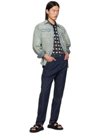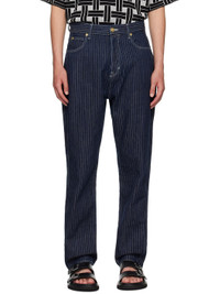 Tapered non-stretch denim jeans. Stripes throughout. · Belt loops · Five-pocket styling · Button-fly · Logo patch at back waistband · Logo-engraved gold-tone hardware · Contrast stitching in tan Supplier color: Rinse blue denim