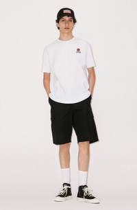Thanks to their loose fit and multiple pockets, these cargo shorts offer a wide range of streetwear looks. In the same vein as the collection, it gets a nautical feel by pairing it with a 'KENZO Sailor' striped rugby polo and a sailor hat. For a more conventional sportswear look, wear it with a T-shirt embroidered with the BOKE FLOWER motif on the breast, and a cap. Cargo shorts. Side pockets. 2 large flap pockets on each side. 2 flap pockets on the back. KENZO Paris label on the pocket. Drawstrings at the waist. Zip and button closure. SIZE & FIT Loose cut. Medium-high waist. Leg length: 57 cm. COMPOSITION & CARE Made in Bulgaria 100% cotton