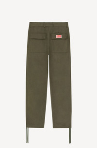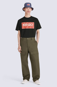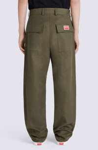 True to the 'real-to-wear' spirit of this collection, these cargo trousers blend comfort with style. The perfectly-placed pockets add a touch of graphic style while the legs can be left hanging straight or gathered with the drawstrings. We like how they look with a workwear jacket in the same hue, or mixed and matched with a contrasting blazer and shirt. Thick cotton cargo trousers. Belt loops. 2 side pockets, 2 front flap pockets on thighs and 2 flap pockets on back. KENZO Paris logo embroidered on back pocket flap. Adjustable drawstrings at ankles. Zip and button fastening with boke-shaped button. SIZE & FIT Leg length: 115 cm. The model is 186 cm tall and wears a size 40. COMPOSITION & CARE Made in Romania 100% cotton