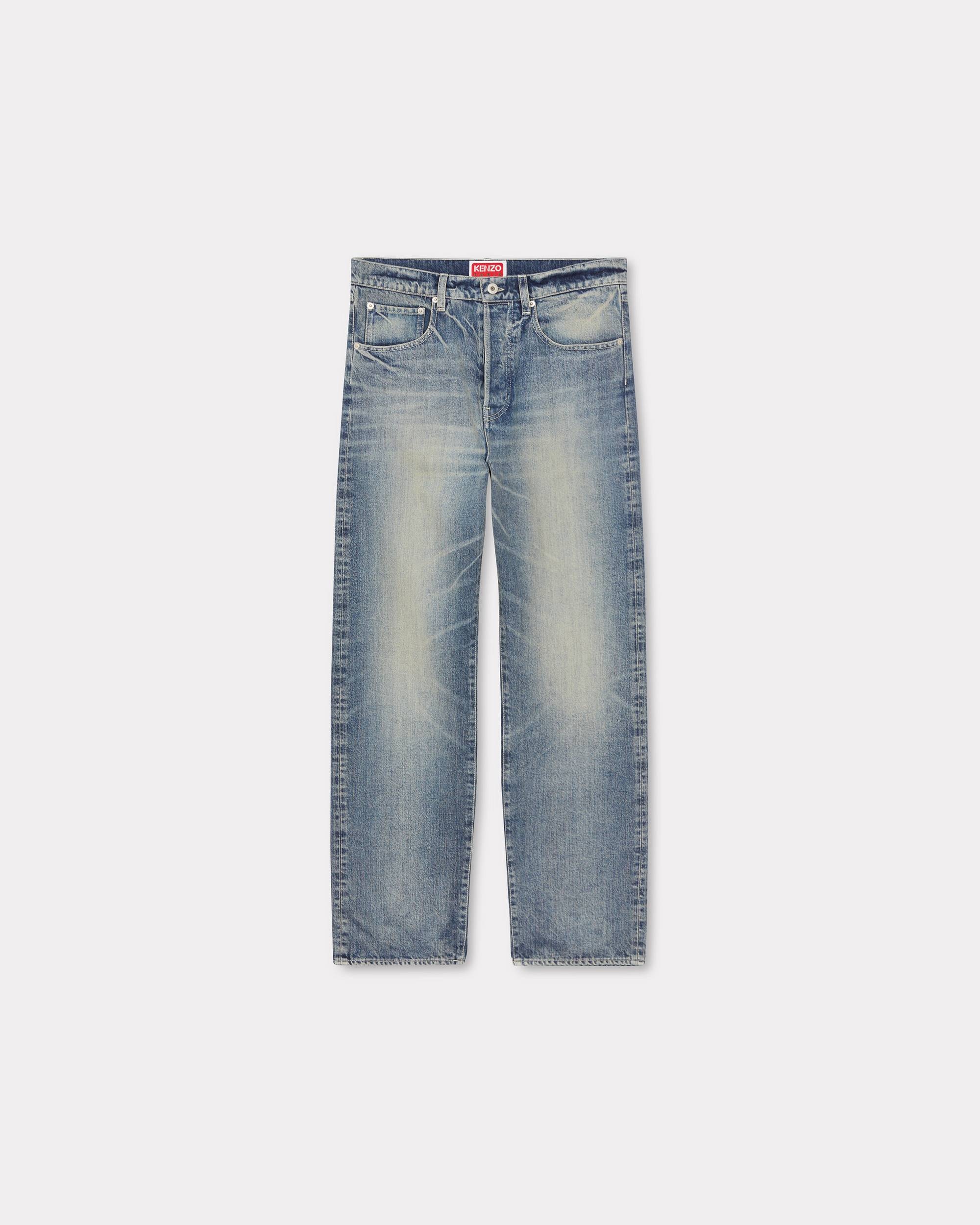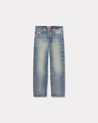 These straight-fit jeans evoke the brand's origins with their depiction of Mount Fuji on the back. The other back pocket is embroidered with the 'KENZO Paris Creations pour un monde plus beau' (for a more beautiful world) design from the archives. Easy to wear, this is a wardrobe basic from the VESTIAIRE DE NIGO FOR KENZO collection. 'KENZO Creations' Asagao straight-fit jeans in Kuroki Japanese denim. KENZO Paris jacron on the back. Mount Fuji embroidered on one back pocket. 'KENZO Paris Creations pour un monde plus beau' embroidered on one back pocket. Two side pockets and one ticket pocket. Two back patch pockets. Belt loops. Zip and button fastening. Product Reference: FE55DP3316I7.DY SIZE & FIT Straight fit.Leg length: 113 cm.The model is 185 cm tall and wears a size M. COMPOSITION & CARE Made in Tunisia 100% cotton Do not bleach Mild professional dry-cleaning in: hydrocarbons Iron at low temperature Line drying in the shade Do not tumble dry 30°C very mild fine wash Mild professional wet-cleaning
