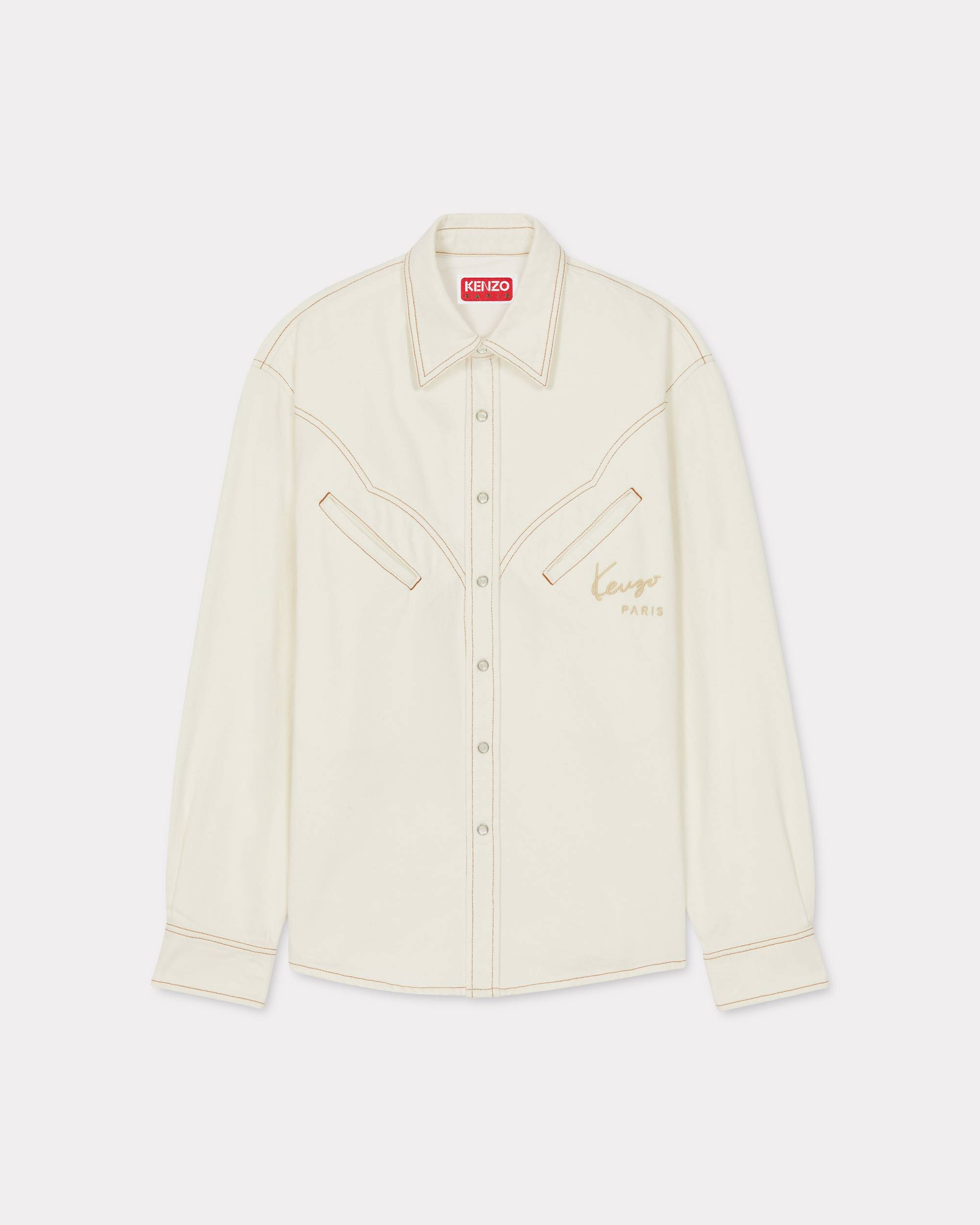 'KENZO Creations' western shirt. Archive embroidery ‘KENZO Paris Créations pour un monde plus beau’ on the chest and back. Unique western stitching on the top of the shirt. Casual western shape. Kuroki Japanese denim. Pearly snap buttons. SIZE & FIT The model is 185 cm tall and wears a size M. Casual fit. Back length at 76 cm. COMPOSITION & CARE Made in Bulgaria 100% cotton