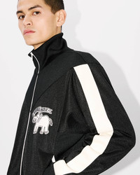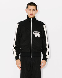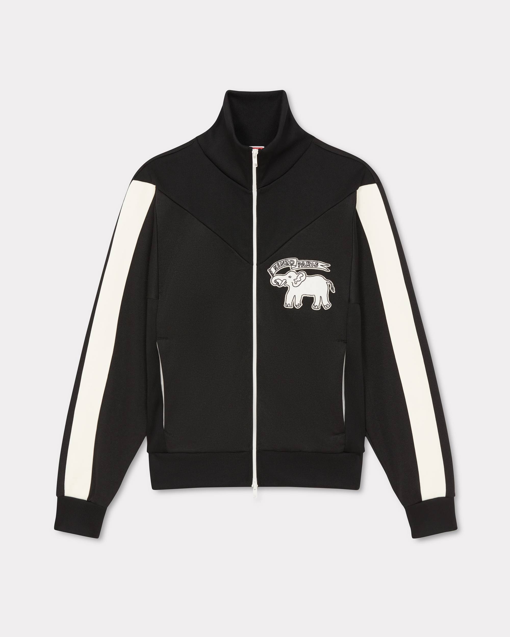 This 'KENZO Elephant Flag' tracksuit top offers a retro style and celebrates a must-have KENZO mascot. The iconic Elephant appears on the chest in the style of American university sportswear. You will adore the contrasting white bands on the sleeves and the shiny interlock fabric. Wear it with the matching joggers for a complete streetwear look. 'KENZO Elephant Flag' tracksuit jacket. Long sleeves. Elephant patch on chest. Contrasting white bands on sleeves. Two side pockets. Fastens with a double zip. SIZE & FIT The model measures 185 cm and wears size M. COMPOSITION & CARE Made in Portugal 55% polyester, 43% viscose, 2% elastane