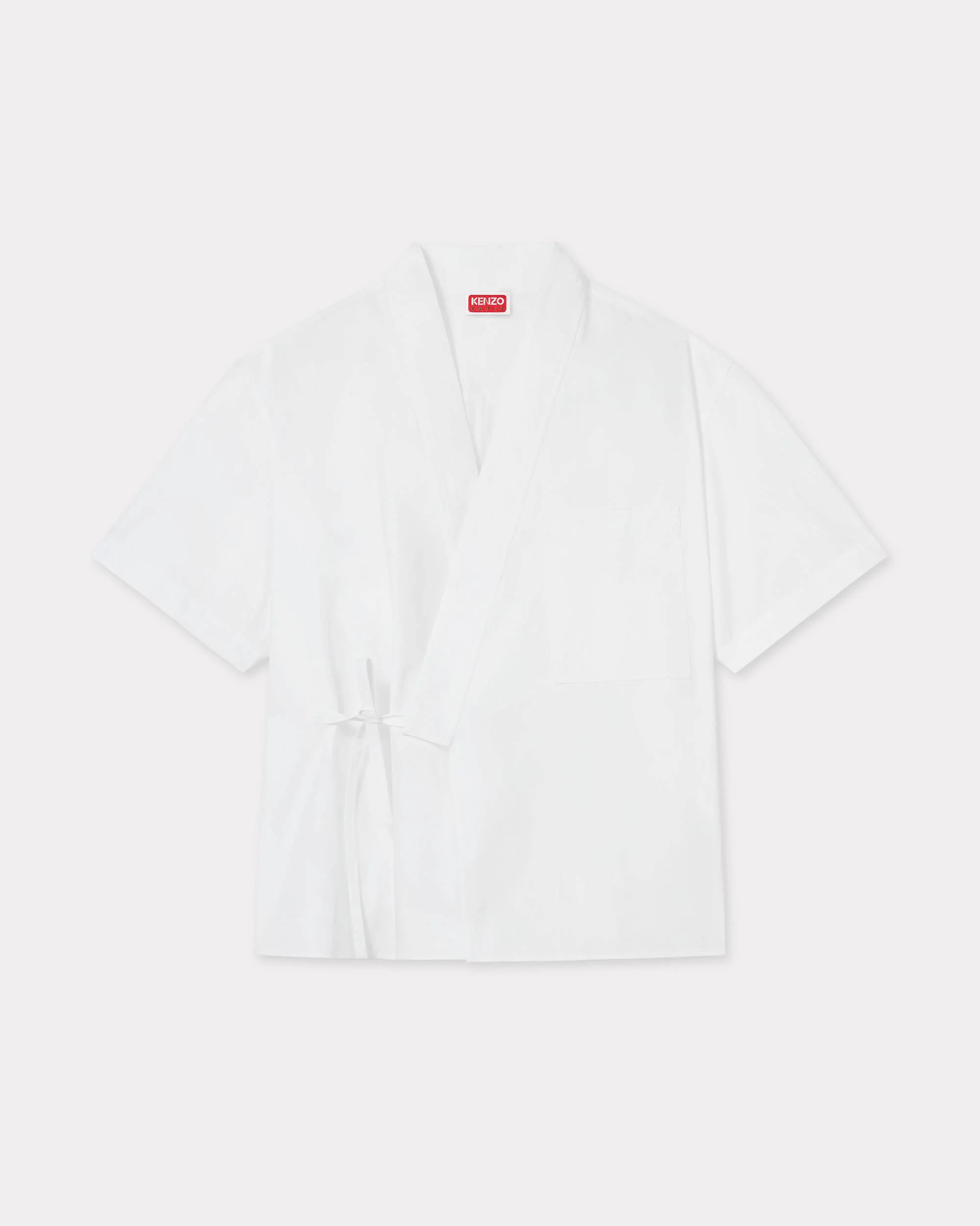 Kimono short sleeve shirt. Cotton poplin. Chest pocket. Attach strap to lapel flap. Tone on tone 'KENZO Paris' on the back neck. Embroidery. Product Reference: FF65CH1319L1.01 SIZE & FIT The male model is 185 cm tall and is wearing size M. Back length at 70 cm. Kimono fit. COMPOSITION & CARE Made in Tunisia 100% cotton Do not bleach Do not tumble dry Very mild professional wet-cleaning
