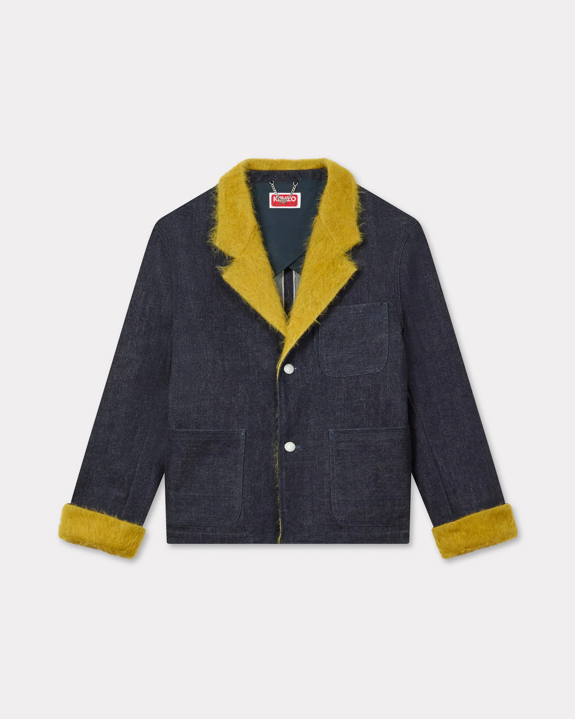 Fur tailored jacket. Rinse selvedge denim. Hairy wool alpaca and mohair mix. Kuroki Japanese denim. Half lined. One chest pocket & two front pockets. Two inside pockets. 'KENZO Paris' leather jacron on the back neck. Product Reference: FF65DV2016Q1.DM SIZE & FIT The male model is 185 cm tall and is wearing size M. Back length at 71 cm. Straight fit. COMPOSITION & CARE Made in Tunisia 100% cotton Do not bleach Iron at low temperature Line drying in the shade Do not wash Do not wet-clean