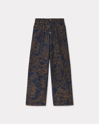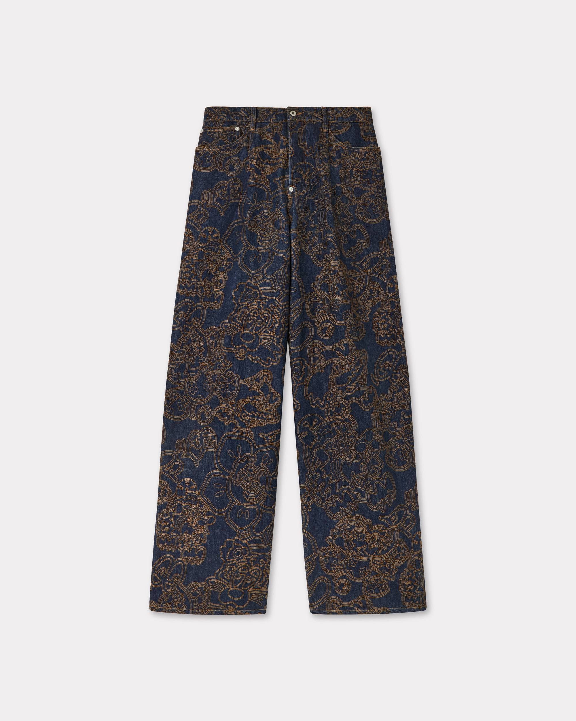 'KENZO by Verdy' embroidered buggy jeans in japanese denim. KENZO Paris leather jacron on the back. KENZO Paris button. Mount Fuji back pocket topstitching. Kaihara Japanese denim. One front ticket pocket. Two side pockets. Two back pockets. Product Reference: FF55DP4196V1.DM SIZE & FIT The model is 185 cm tall and is wearing a size M. Relax fit. Leg length at 111 cm. COMPOSITION & CARE Made in Portugal 100% cotton Do not bleach Mild professional dry-cleaning in: hydrocarbons Iron at low temperature Line drying in the shade Do not tumble dry Do not wash Do not wet-clean