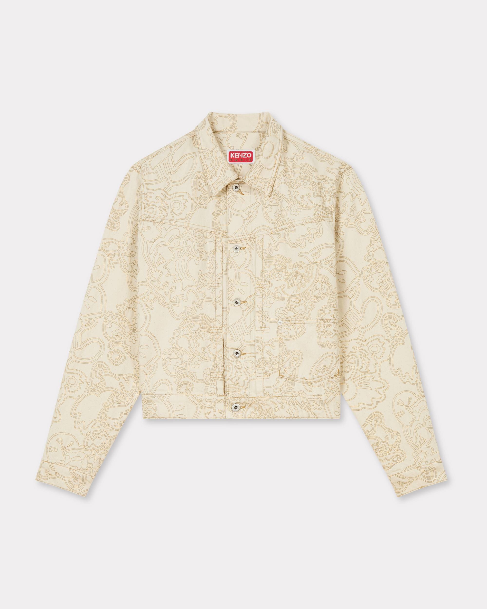 'KENZO by Verdy' embroidered trucker jacket in japanese denim. KENZO Paris leather jacron on the back neck. KENZO Paris buttons. Kuroki Japanese denim. Contrasted stitches. Two chest pockets & cinch buckle. Product Reference: FF55DV3096W1.WM SIZE & FIT The model is 185 cm tall and is wearing a size M. Cropped boxy fit. Back length at 60 cm. COMPOSITION & CARE Made in Portugal 100% cotton Do not bleach Mild professional dry-cleaning in: hydrocarbons Iron at low temperature Line drying in the shade Do not tumble dry Do not wash Do not wet-clean