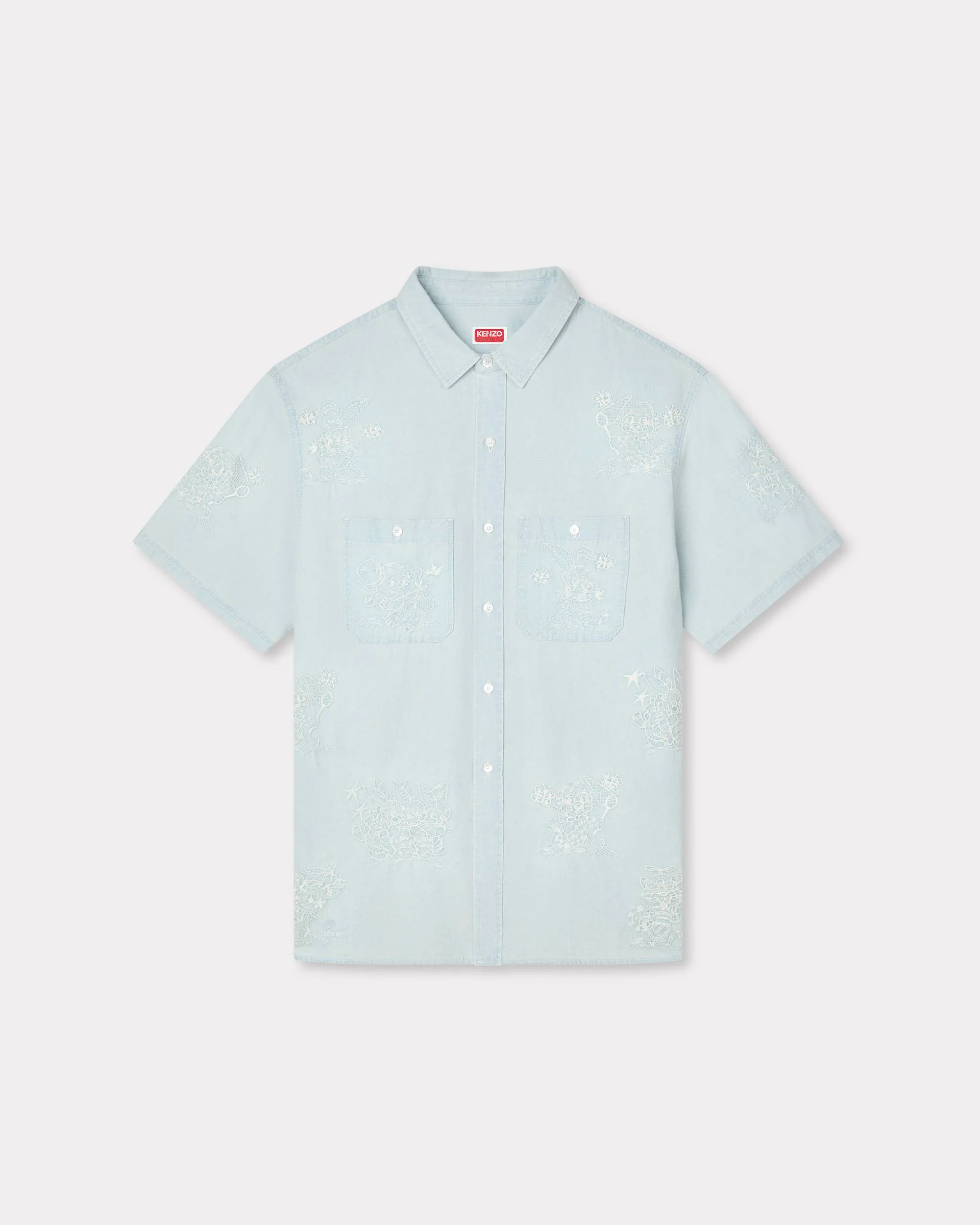 This short-sleeved stone bleach chambray shirt features two chest pockets, a relaxed fit and embroidered cartoon characters introduced at the Spring/Summer 2026 show. 'KENZO Cartoon' embroidered short sleeve shirt. Embroidered stone bleach chambray. Dova Japanese denim. Two chest pockets. Embroidered. KENZO signature on the back neck. Product Reference: FG55DC1047F0.DY SIZE & FIT The model is 185 cm tall and is wearing size M. Casual fit. Back length at 78 cm. This item fits true to size. Take your usual size. COMPOSITION & CARE Made in Portugal 100% cotton Do not bleach Mild professional dry-cleaning in: hydrocarbons Iron at low temperature Line drying in the shade Do not tumble dry Hand wash Very mild professional wet-cleaning