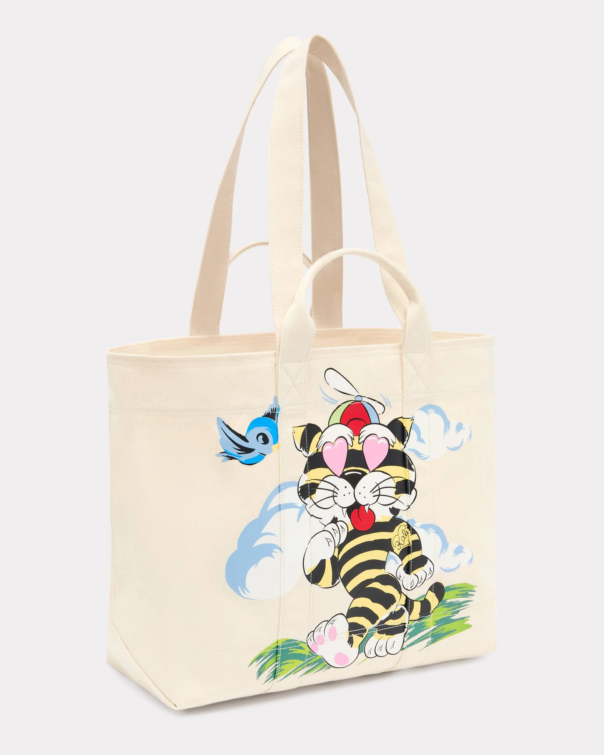 'KENZO Cartoon' large tote bag in canvas. 'KENZO Utility' line. Can be worn by hand or on the shoulder. Two short handles. Two long handles. Press stud closure. One inside small flat pocket. Printed artwork from the 'KENZO Cartoon' story on the front. Embroidered 'KENZO Archive' signature on the back. Product Reference: FG58SA911F39.03.TU SIZE & FIT Dimensions: 53 x 34 x 15 cm. Short handles height: 9 cm. Long handles height: 32 cm. COMPOSITION & CARE Made in China 100% cotton Do not bleach Do not dry-clean Do not iron Do not dry Do not tumble dry Do not wash Do not wet-clean