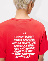 Available for a limited time after the SS26 show, this T-shirt is a continuation of a story that began with the FW25 show, featuring Luke and K@li, the male and female rabbits. This season, their story takes a turn and their romance comes to an end, making way for a new chapter in which Quique, the passionate tiger, manages to win K@li's heart. On the back, an original poem recounts this changing love story, giving the T-shirt a narrative dimension. The piece also pays homage to the House's FW79 show, known for its characters such as Pierrot, Mickey and giant cuddly toys, which are the direct inspiration for these contemporary figures. 'KENZO Cartoon' Quique T-shirt in cotton. Single Jersey for a comfortable feel & transeasonal weight. Front and black placed printed graphics. Printed poem at back. Seasonal branding printed in the artwork. Product Reference: FG55TS2124SK.22 SIZE & FIT The model is 185 cm tall and is wearing size M. Classic fit. COMPOSITION & CARE Made in Portugal 100% cotton Do not bleach Mild professional dry-cleaning in: hydrocarbons Iron at low temperature Line drying in the shade Do not tumble dry 30°C mild fine wash Mild professional wet-cleaning